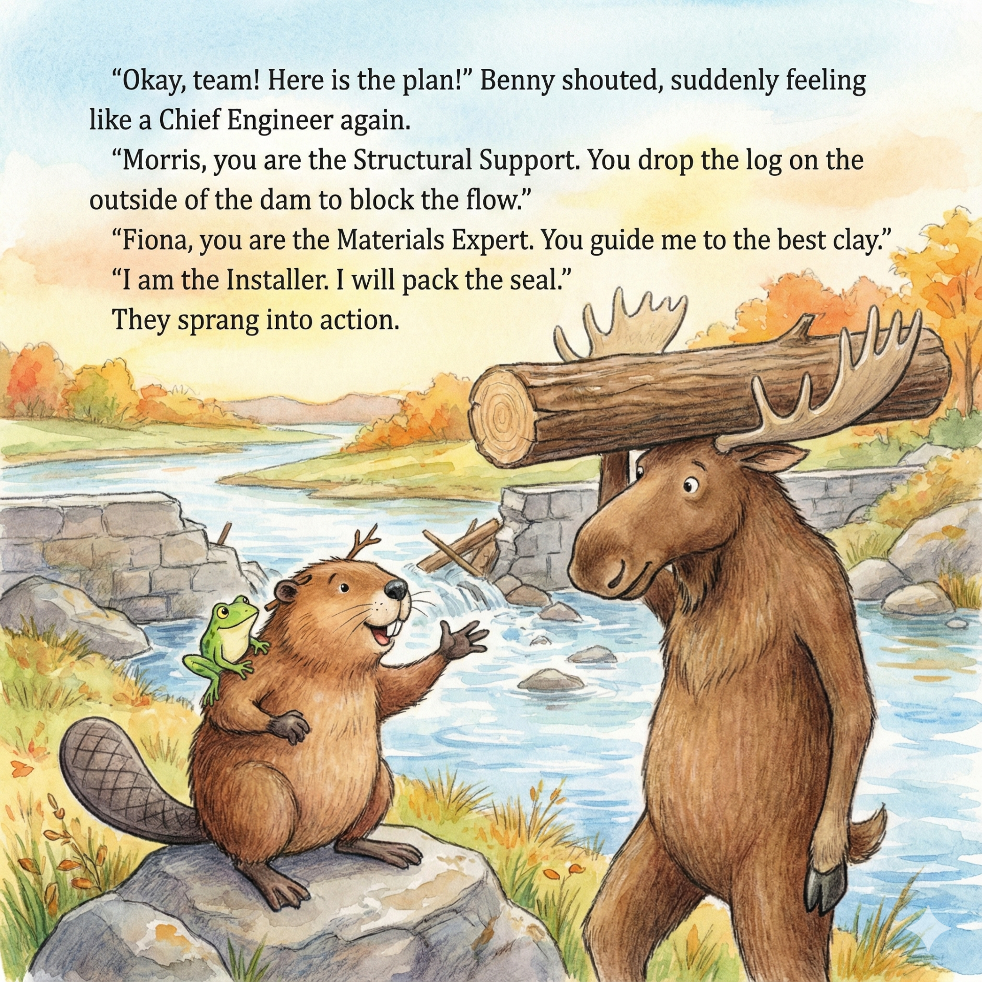 Benny bravely tries to fix the dam on his own using sticks and stones but the powerful current is too strong. Just when things seem hopeless, his forest friends step in. Fiona the Frog uses her sharp observation skills, and Morris the Moose provides his incredible strength. Together, they create a smart plan using natural materials like logs and blue clay to repair the dam.