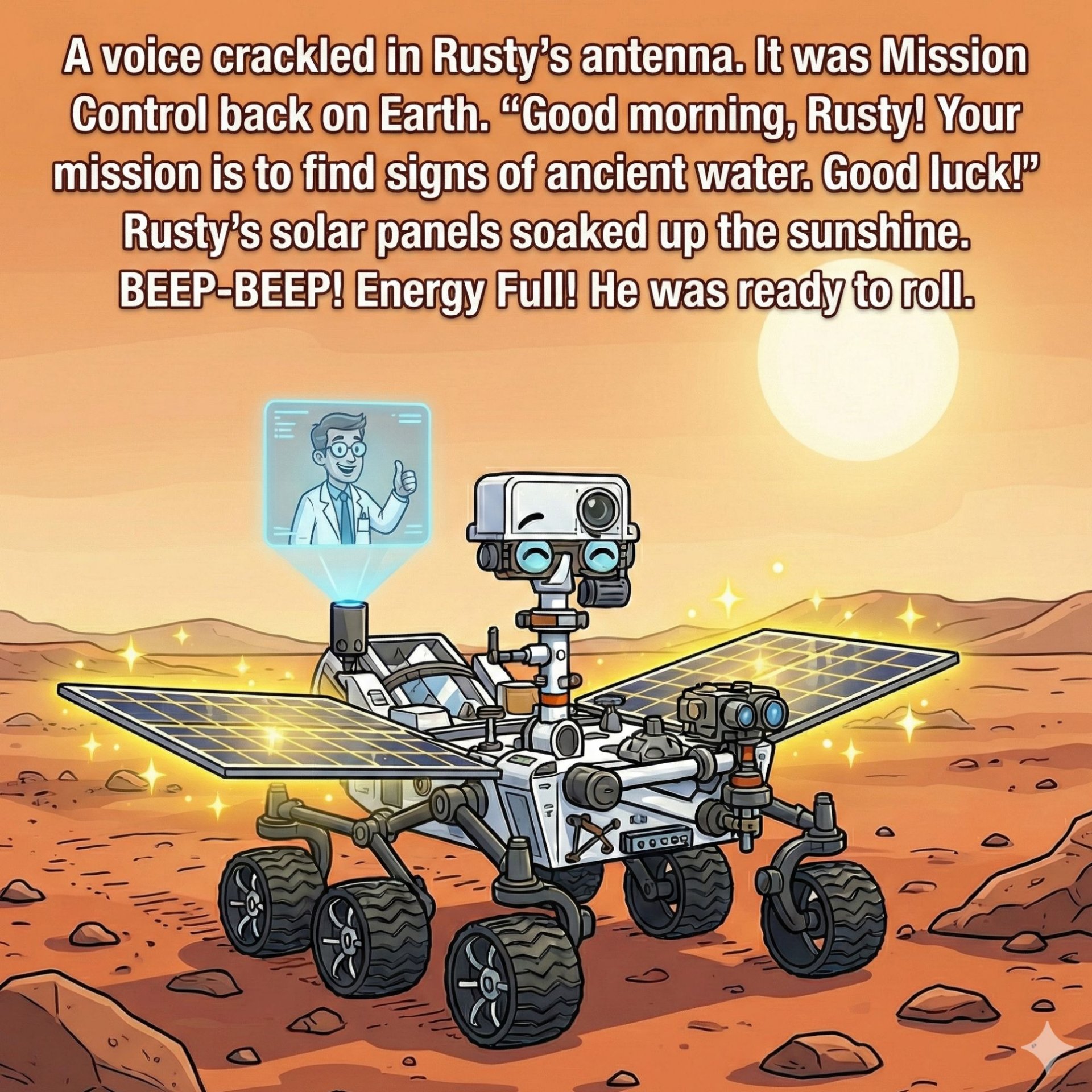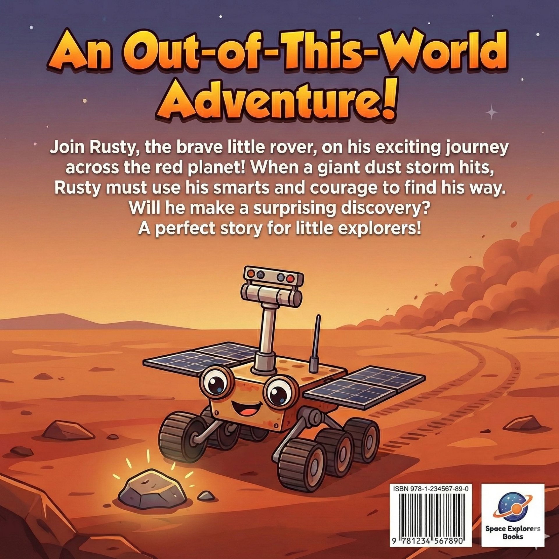 Rusty is not a normal car. He has six sturdy wheels, a camera for an eye, and solar panels on his back. He lives all alone on Mars, the Red Planet.