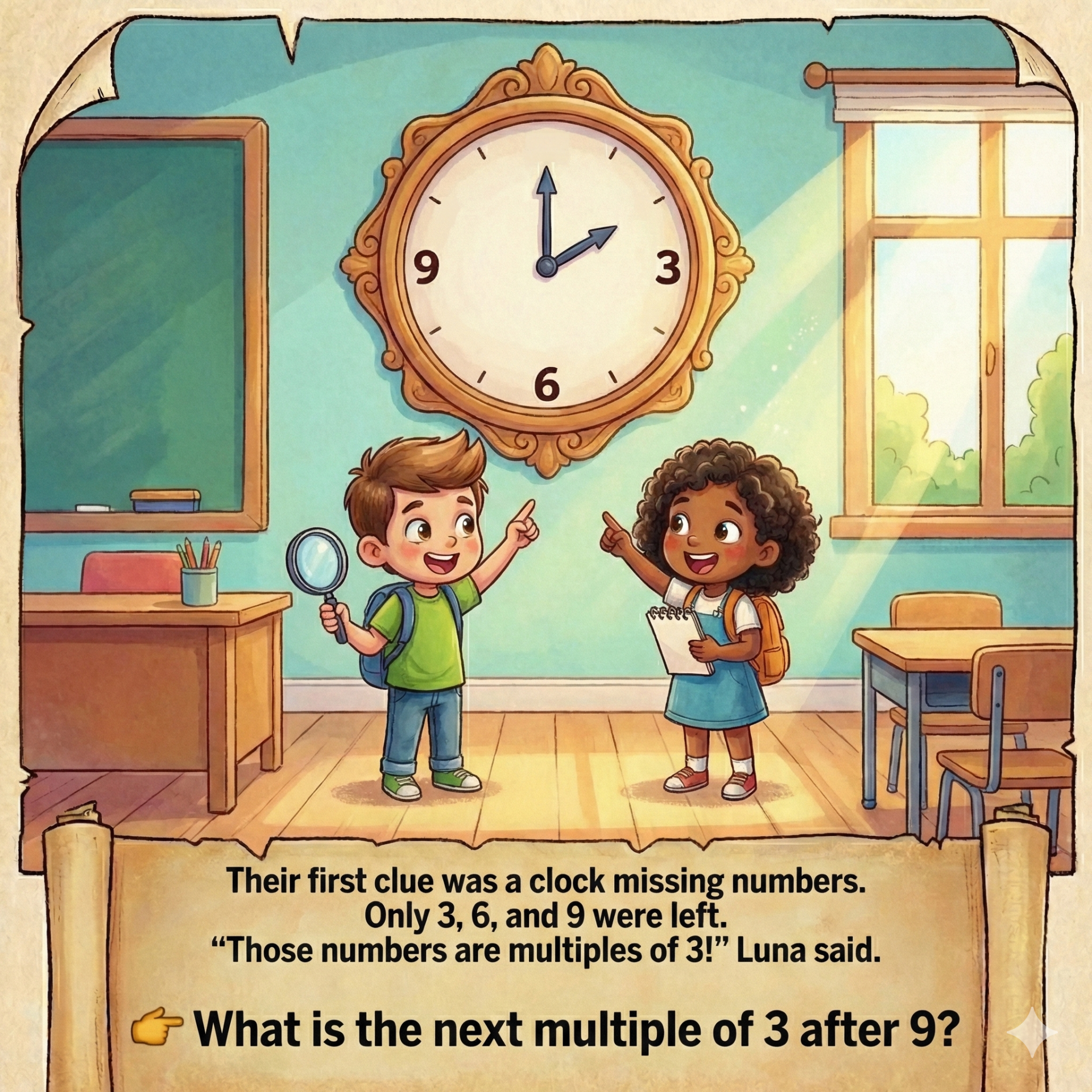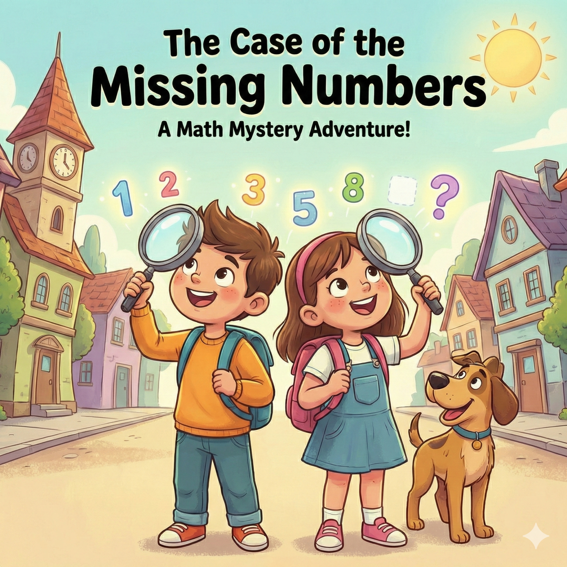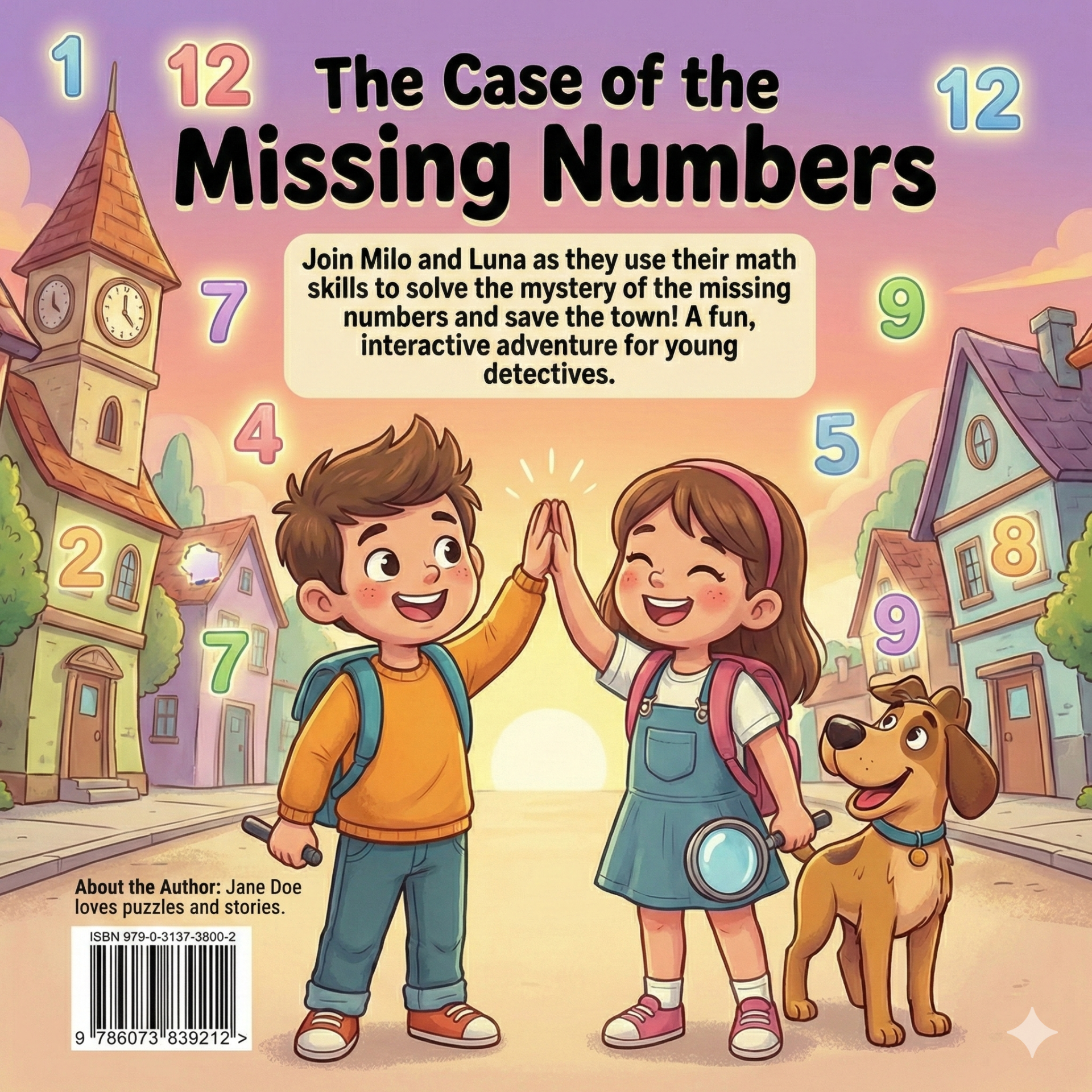 In the cheerful town of Numberville, numbers begin disappearing from clocks, signs, and books. Two curious friends, Milo and Luna, step in to solve the mystery. As young readers follow their journey, they help crack clues involving addition, subtraction, number patterns, counting by 2s, and multiples of 3.