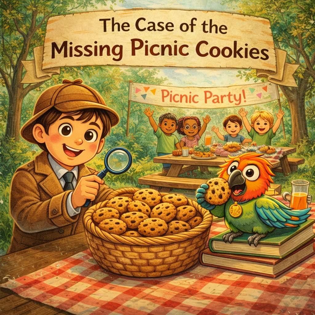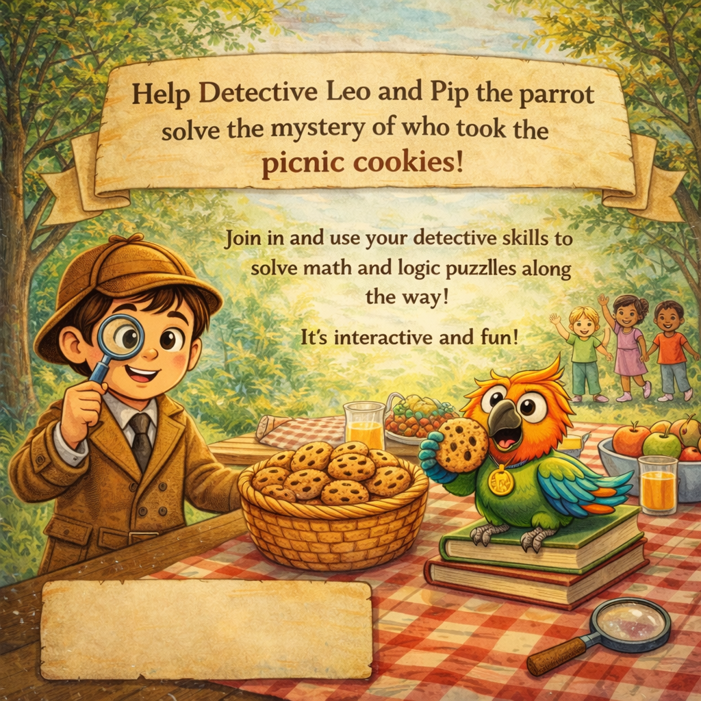 During a cheerful school picnic, Mrs. Higgins’ basket of delicious cookies suddenly disappears! Young readers team up with Detective Leo and his clever parrot Pip to uncover clues scattered across the park. Each clue presents an engaging math or logic puzzle, helping children actively participate in the story.