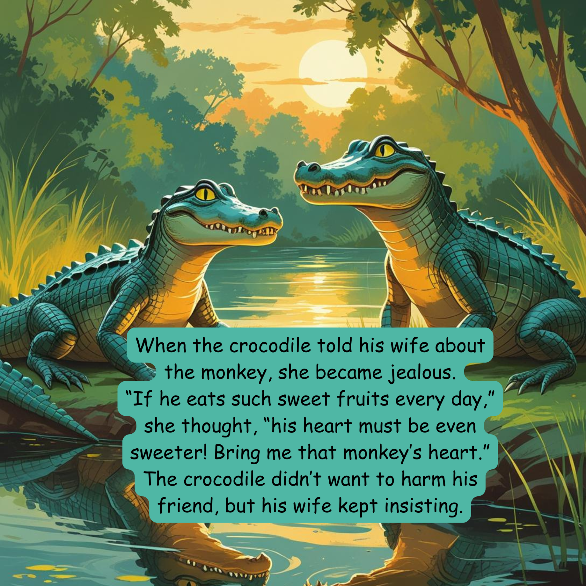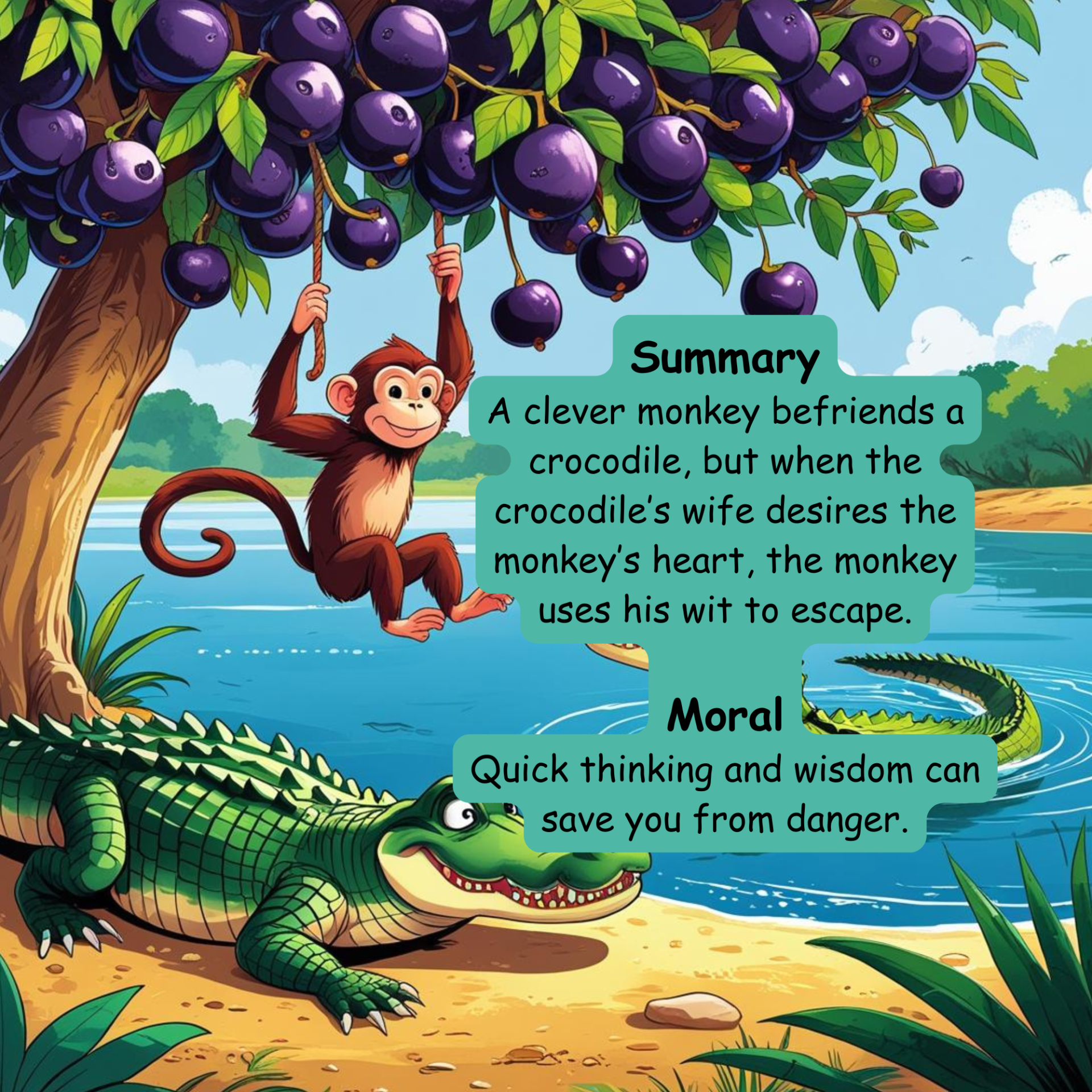 This is one of the most famous Panchatantra stories. It tells the tale of a clever monkey who makes friends with a crocodile. But when the crocodile’s wife demands the monkey’s heart, the monkey uses his wit to escape the trap and save himself.