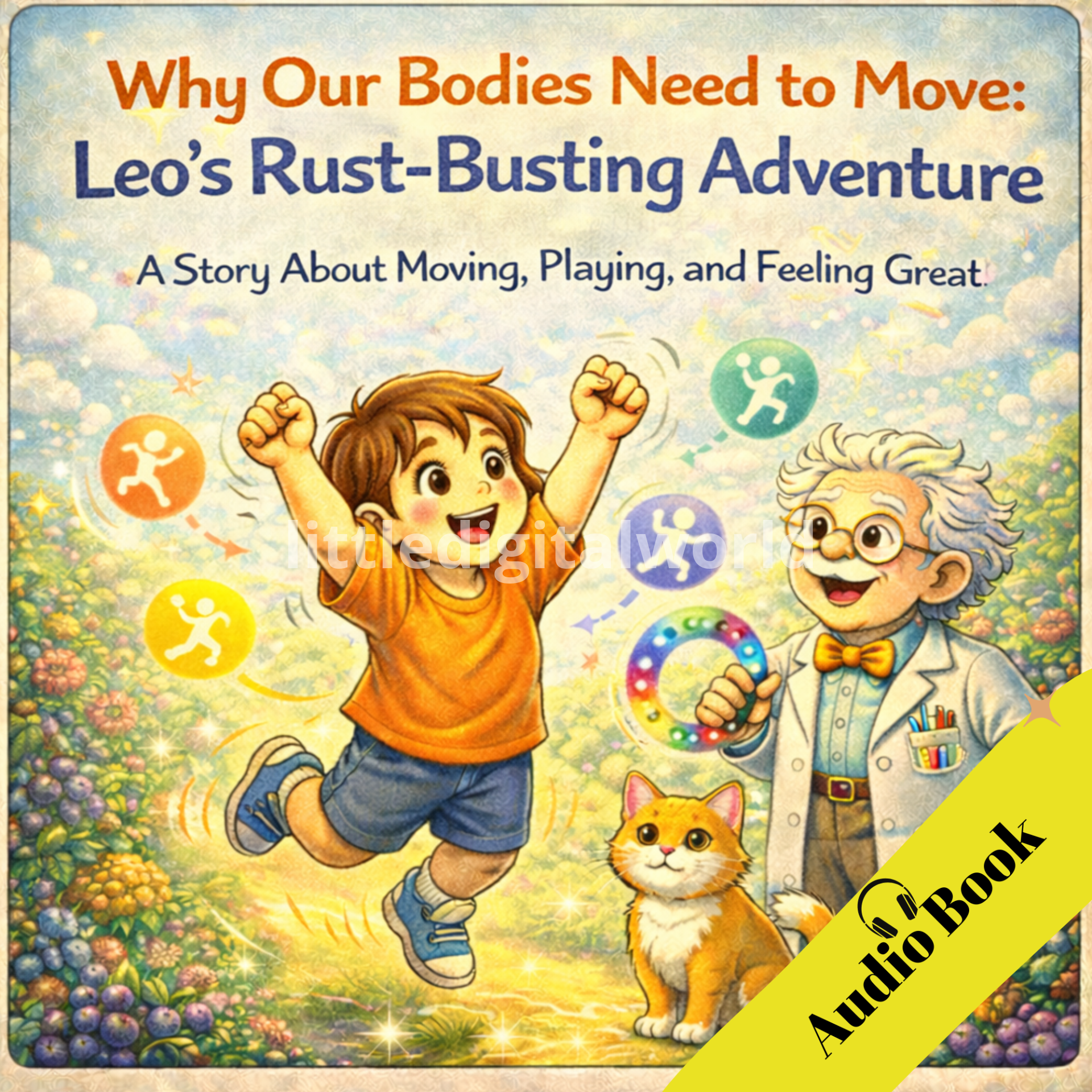 Together with Dr. Fizzlepop and the wise cat Whiskers, Leo sets off on a playful “Rust-Busting Adventure,” filled with stretching, jumping, wiggling, running, and simple activities kids can try themselves. As Leo moves more, he feels stronger, happier, and full of energy again — learning firsthand how exercise helps joints, muscles, and moods.