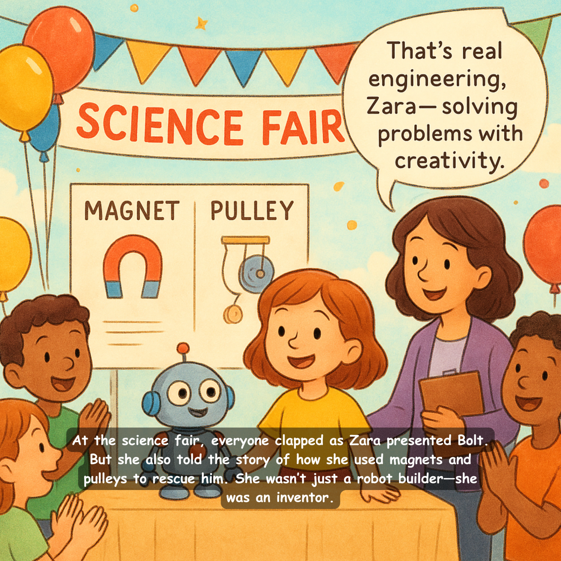 Zara loves building things, and her proudest creation is a friendly little robot named Bolt. She can’t wait to show him off at the school science fair. But the morning of the big day, something unbelievable happens—Bolt is floating out of her bedroom window, carried away as if by magic!