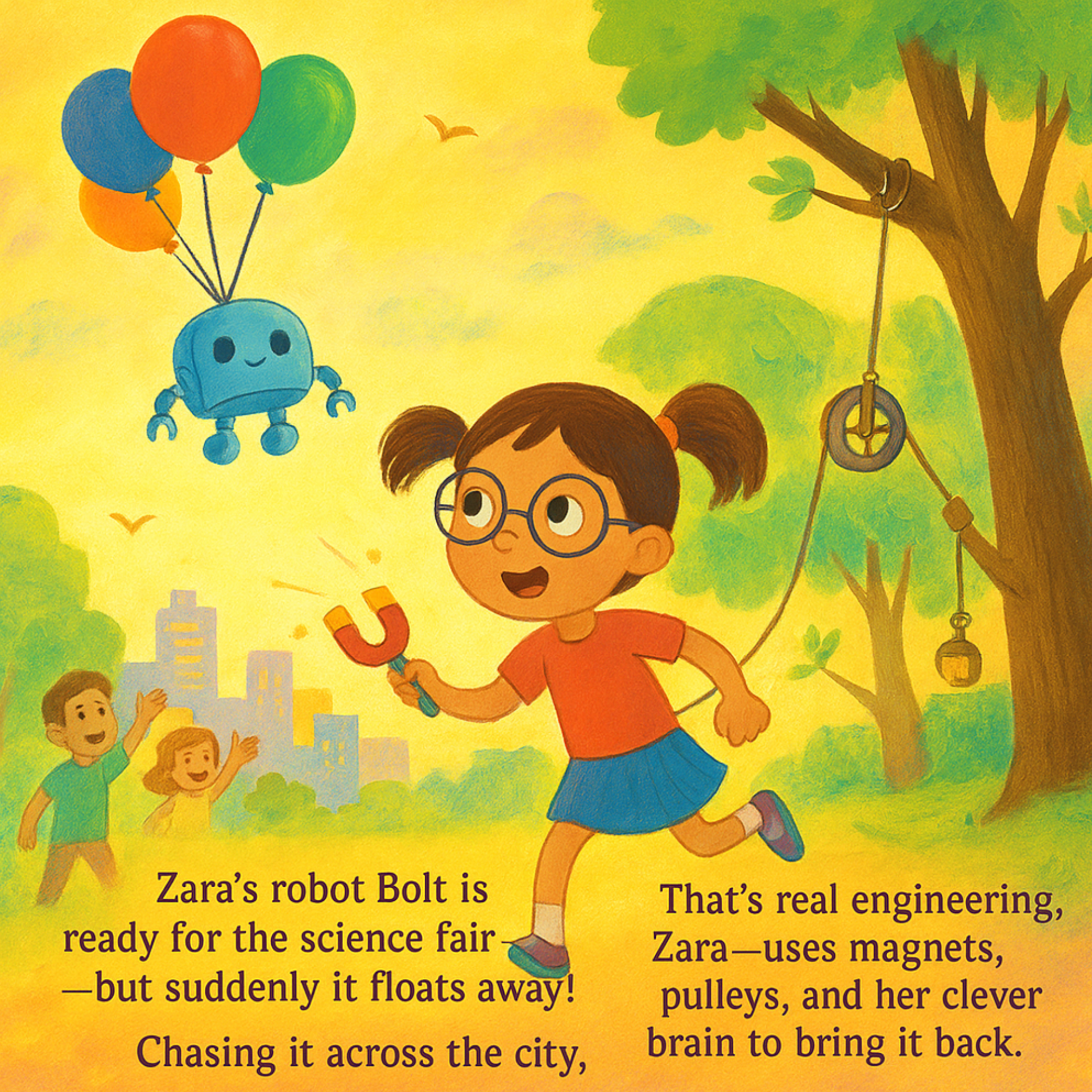Determined not to lose her robot, Zara hops on her bike and races through the city. The chase leads her to a park, where she discovers that magnets, wind, and even tree branches are part of the puzzle. With quick thinking and her trusty science kit, Zara builds clever solutions—including a homemade pulley—to rescue Bolt before he drifts away for good.